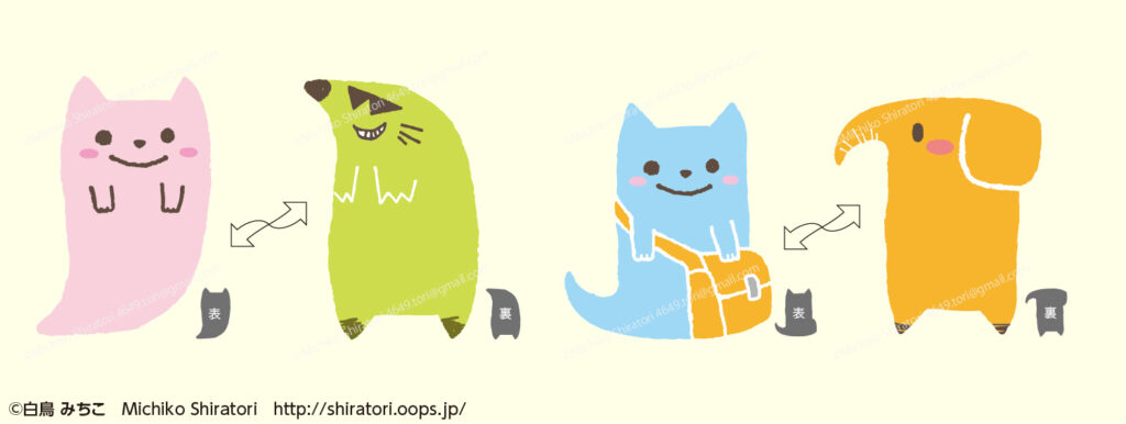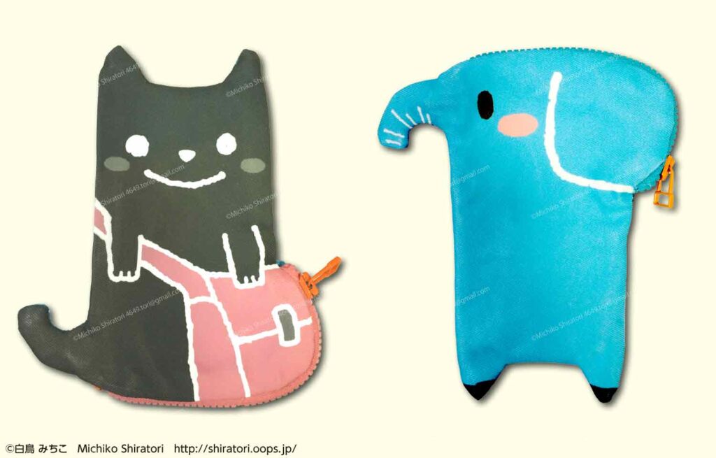 表面はねこ、ひっくり返した裏面は違う動物になるようにデザインしました。このキャラクターデザインを元にポーチを制作しました。