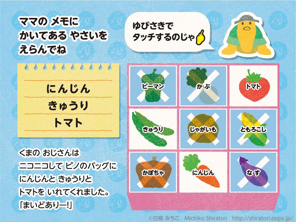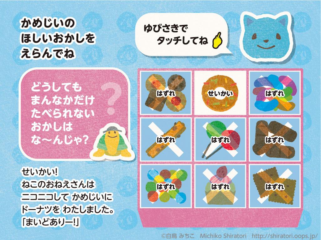 電子書籍ソフト販促用見本として絵本を作成しました。ソフトの特性を活かして、音が出たり、クイズに正解すると次のページに進む仕掛けを考えました。