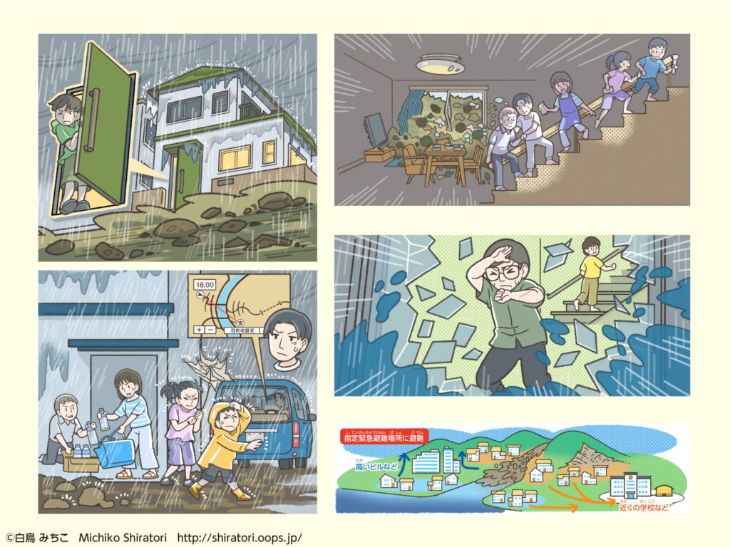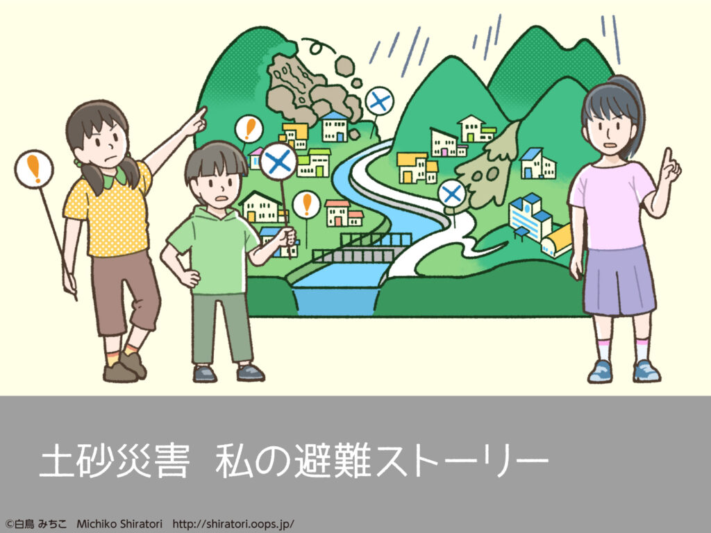 一般社団法人建設コンサルタンツ協会中国支部「土砂災害 私の避難ストーリー」2023年3月サイズ:A4表紙イラスト、本文イラスト24点作成しました。